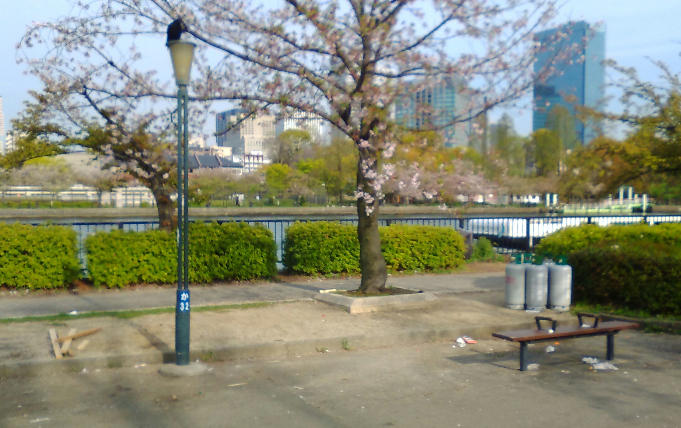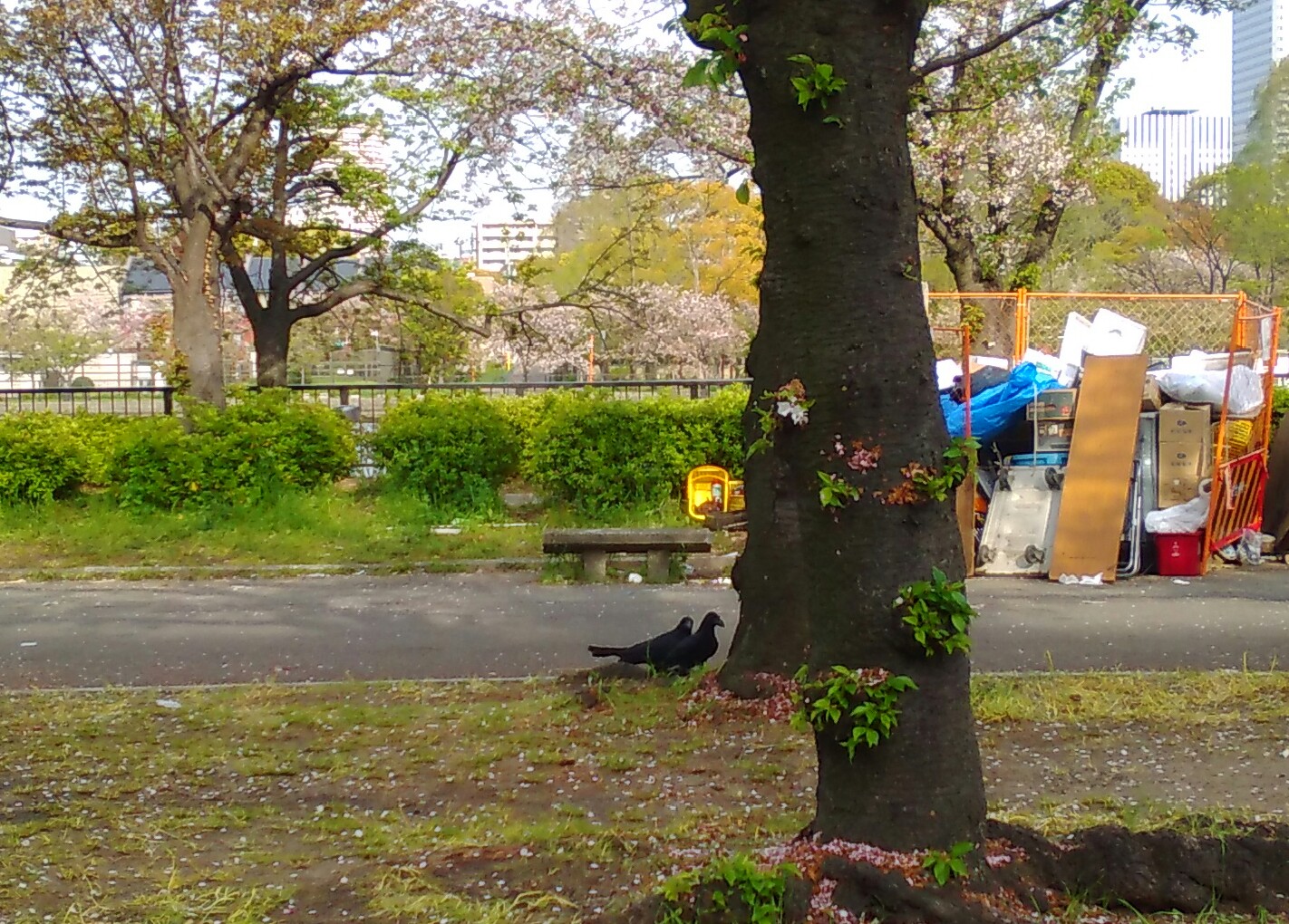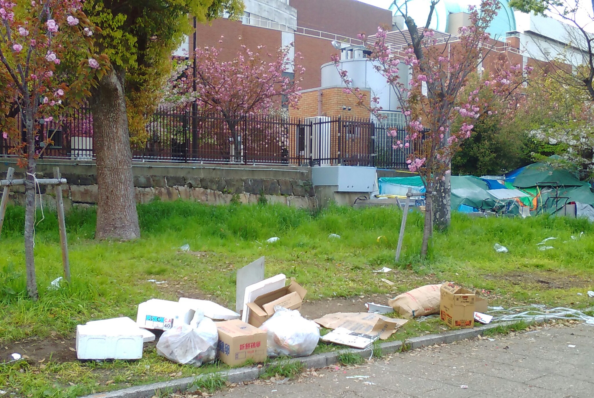 花見客目当ての屋台も並んでいたと思われ、ゴミが散乱。