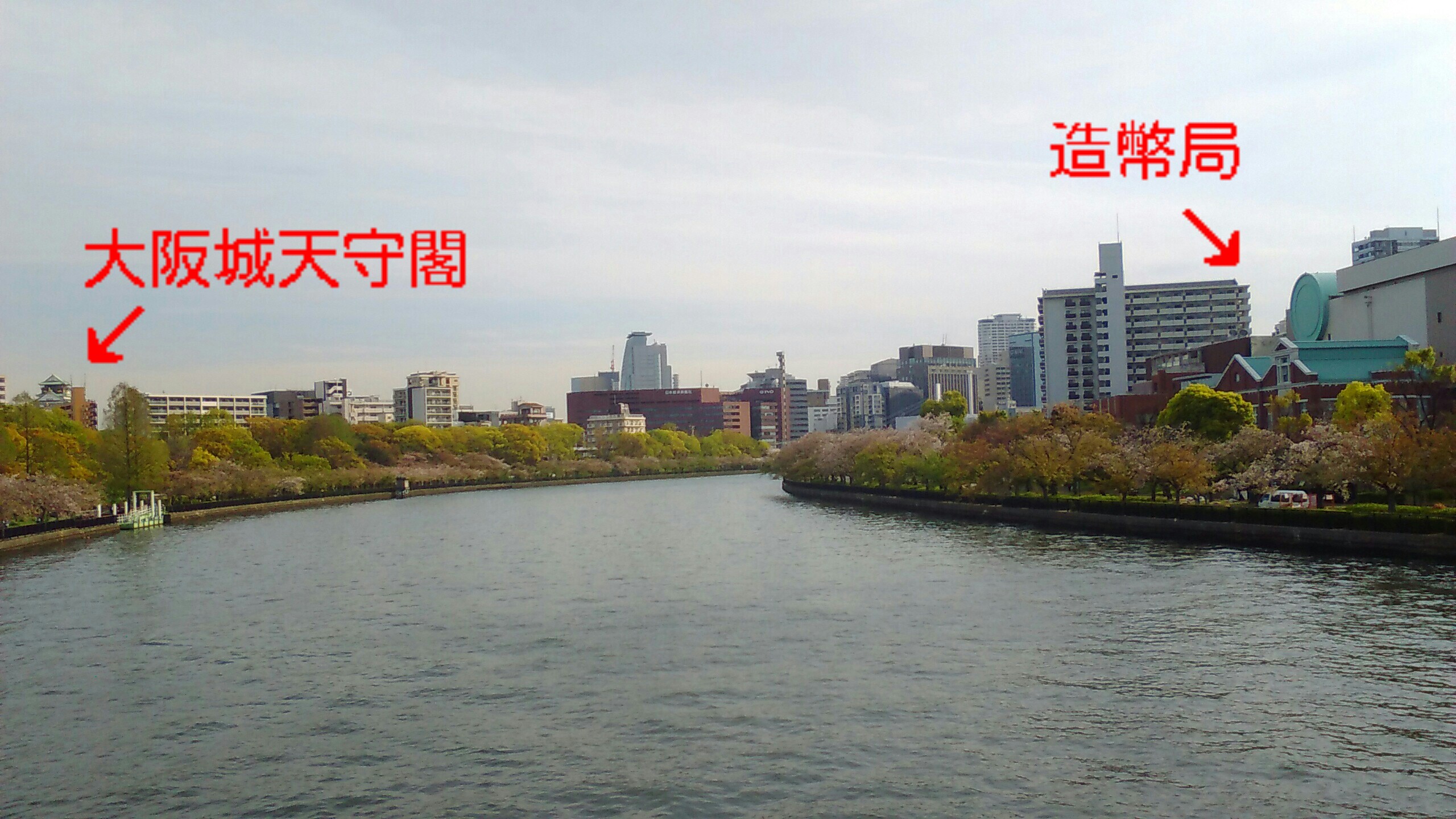 大川を挟んで造幣局と大阪城公園↓↓