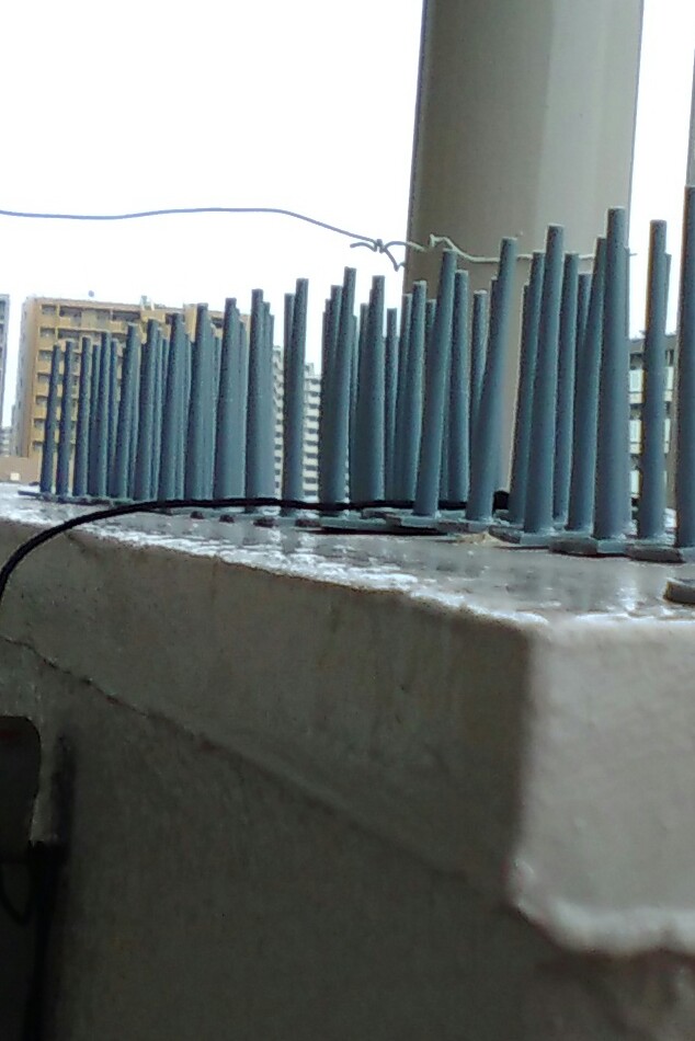 ベランダの柵から高さ5cm位の位置に釣り糸(テグス)を張る方法です。