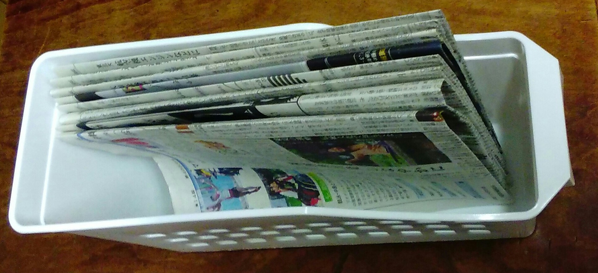 新聞紙はいちいち取りに行ったり、使う度にサイズにカットするのは面倒なので、見開き1枚サイズと片面サイズの2種類をストックし、台所の隅に置いておくのがオススメ。