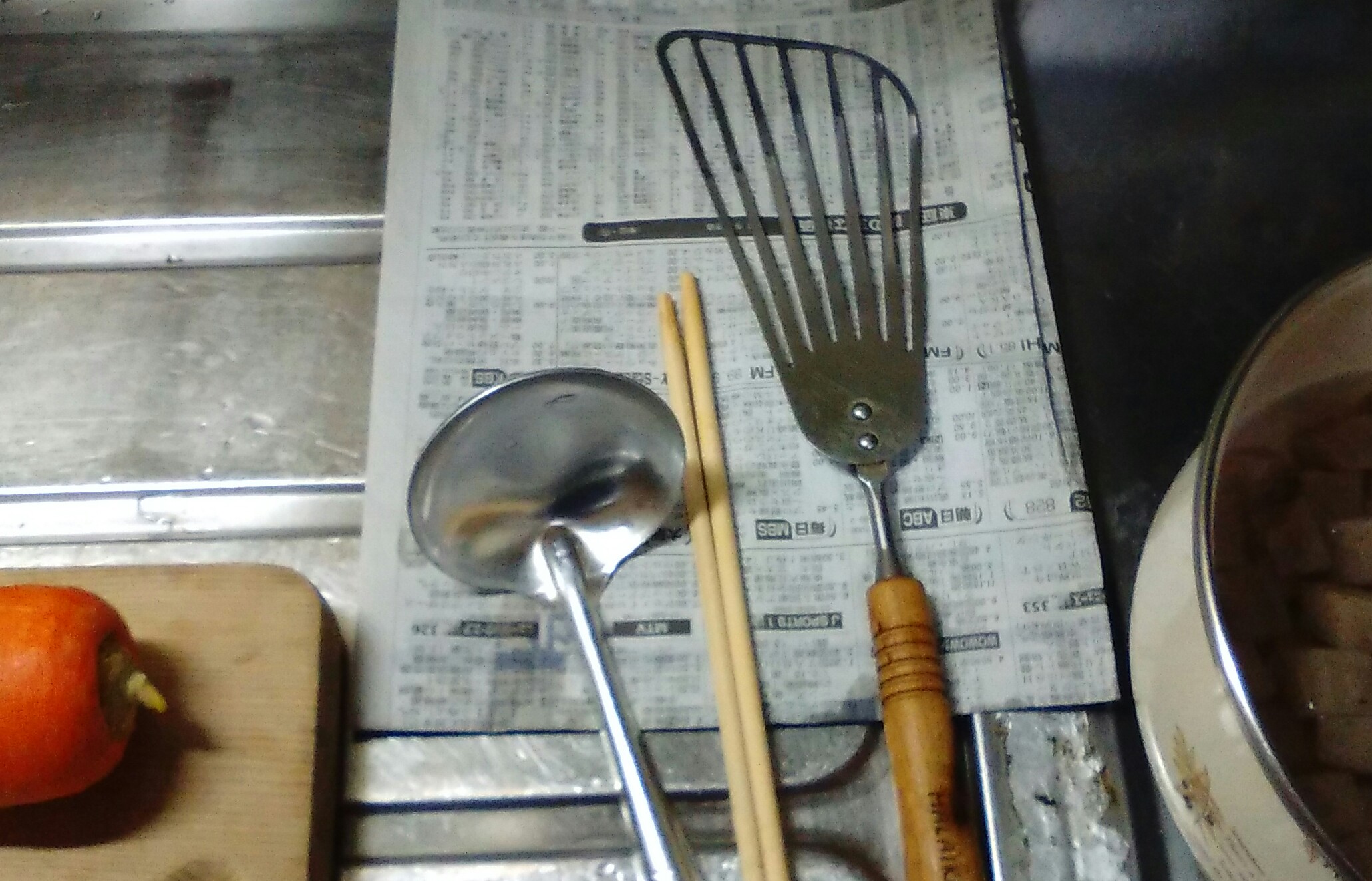 置き場の困る、調理中のお玉や菜箸なども、新聞紙の上に置くと便利です。